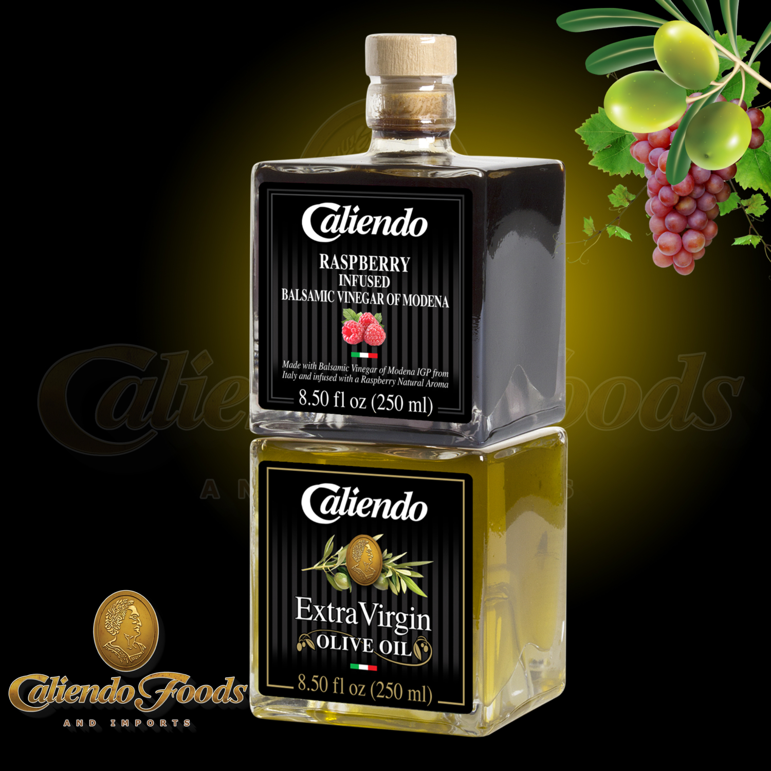 The most unique and functional design in Balsamic Vinegar & Olive Oil – introducing Caliendo NEW! Authentic Balsamic Vinegar of Modena IGP and Premium Extra Virgin Olive Oil Stackable Sets, available in a variety of delicious, gourmet, flavor infused pairings. These sets are perfect for all of your favorite recipes that use olive oil and vinegar, or get creative and use them in your salads, dips, bread, meats, pastas and more! They also make beautiful gift items for holidays, birthdays and anniversaries. Try this one in sweet raspberry flavor paired with premium extra virgin olive oil!